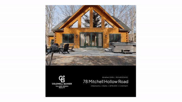Discover the ultimate Catskills mountain retreat with stunning views of the Windham Mountain Club ski slopes in Windham, NY. This beautifully crafted cabin blends timeless rustic character with modern comfort, making it an ideal primary residence, weekend escape, or investment property. The home welcomes you with soaring vaulted pine ceilings, exposed beams, and a spacious open-concept floor plan centered around a cozy fireplace. A dramatic two-story wall of glass fills the interior with natural light while perfectly framing the mountain and ski slope views, which can be enjoyed from all main living areas of the home. Rich wood floors with authentic rough-sawn detailing, rustic log stair railings, and a thoughtful mix of sheetrock and wood accents create an inviting atmosphere that feels both classic log cabin and modern Catskill retreat. A heated ski and boot room, finished in pine, offers a practical and stylish space for storing winter gear and outdoor equipment. The well-appointed kitchen is designed with both functionality and style in mind, featuring granite countertops, hickory cabinetry, and a full suite of stainless-steel appliances. Sliding glass doors lead to a bluestone patio with a new hot tub, perfectly positioned to relax and take in the picturesque views of the Windham ski slopes and surrounding mountains. The layout offers three generously sized bedrooms, each with its own private en-suite bathroom, including a desirable first-floor primary suite with a modern bath and tile walk-in shower. The interior palette of soft neutrals and natural textures mirrors the home's wooded surroundings, enhancing the peaceful mountain setting. A flexible loft area provides an ideal space for a home office, den, or creative studio, while ductless split-unit air conditioning ensures year-round comfort in every season. Just minutes from Windham Mountain Club, skiing, hiking trails, dining, and all Catskill amenities, this exceptional property offers the perfect blend of mountain views, log cabin charm, and modern living—a true Windham NY mountain home and Catskills getaway. A 3D Walkthrough Tour is available in the digital Lookbook or by request.