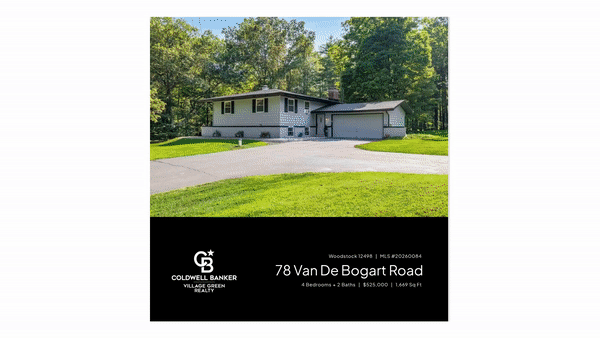 Located on quiet road just minutes from the heart of Woodstock, 78 Van de Bogart Road offers the perfect blend of mid-century charm and modern convivence This home sits on a premier corner one acre lot, meticulously landscaped to provide both curb appeal and a serene, private sanctuary. The upper level of this raised ranch features an open, airy layout designed to bring the outside indoors. The living room offers a cozy wood-burning fireplace for chilly country nights. Step out from the living room onto a private balcony overlooking the expansive, well-manicured yard—the ideal spot for morning coffee while listening to the sounds of the nearby stream. A large eat-in kitchen with ample cabinetry and workspace. Three well-appointed bedrooms and a full bathroom located on the main level. The fully finished ground level offers incredible flexibility for guests, a home office, or a media room. The Great Room features a second fireplace and a custom bar area, perfect for hosting. Large sliding doors open directly onto a rear patio, seamlessly connecting the indoor and outdoor entertaining spaces. A fourth bedroom, a dedicated office space, a half bath, and a large laundry room with extra storage complete the lower level. This property is a true standout, one of the best lots available plus a ''streamside'' feel that captures the quintessential Catskills vibe. A beautiful, level corner lot with mature plantings and plenty of room for a garden or pool. Don't overlook the oversized 2-car attached garage with plenty of room for vehicles and a workshop area. Move in with peace of mind—the home features a newer roof, recent interior/exterior paint, and a freshly sealed driveway. Enjoy the best of the Hudson Valley. You are perfectly positioned between the eclectic Village of Woodstock and the vibrant downtown of Kingston, with easy access to the NYS Thruway and NYC bus lines. A 3D Walkthrough Tour is available in the digital Lookbook or by request.